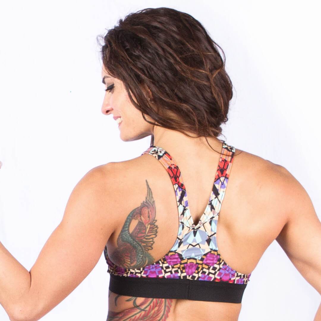 Top in lycra con lacci sul decolté spalle a vogatore ampie.