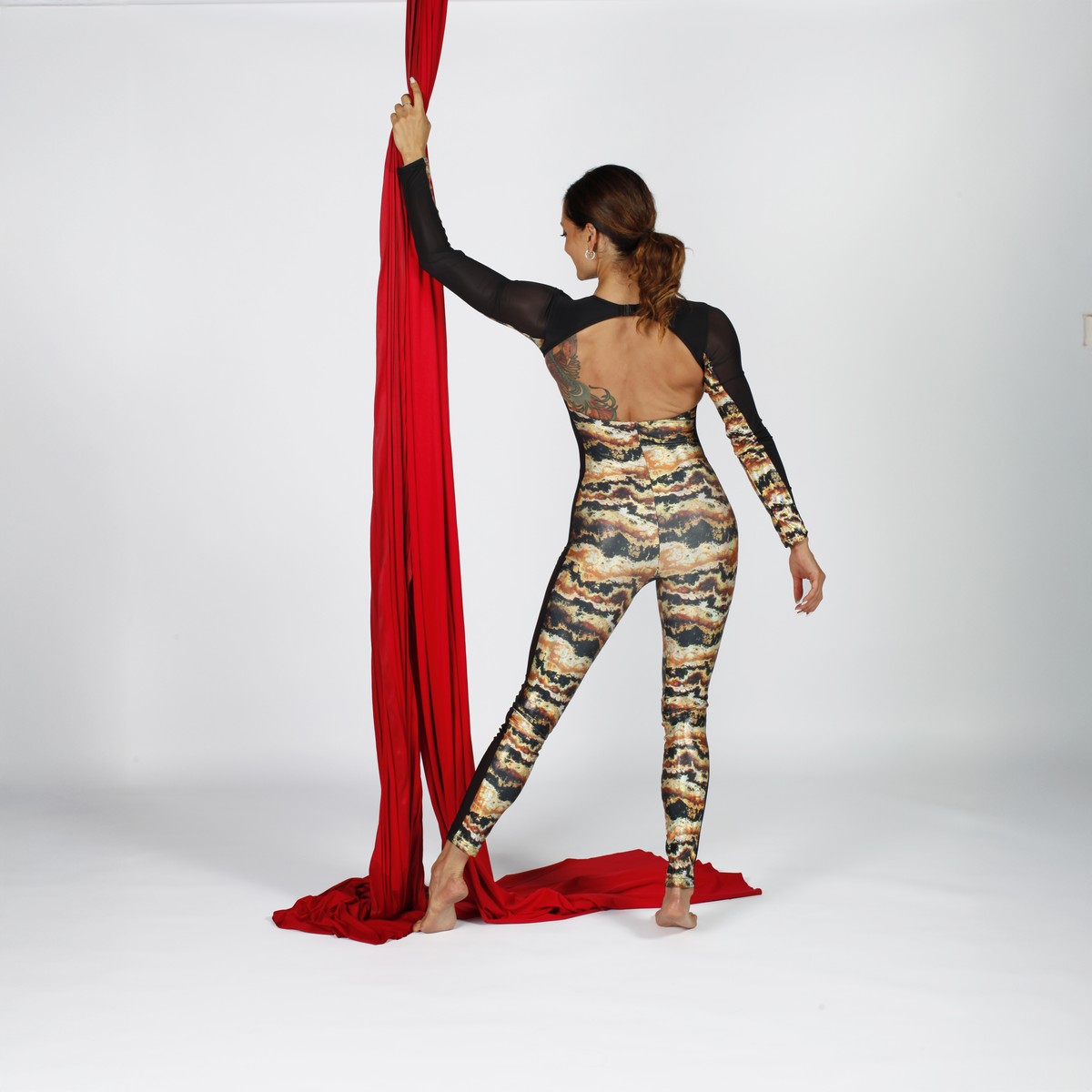 Accademico Aerial performance in lycra fantasia ed inserti in siviglia semitrasparente, schiena scoperta e chiusura con gancetto sul collo.