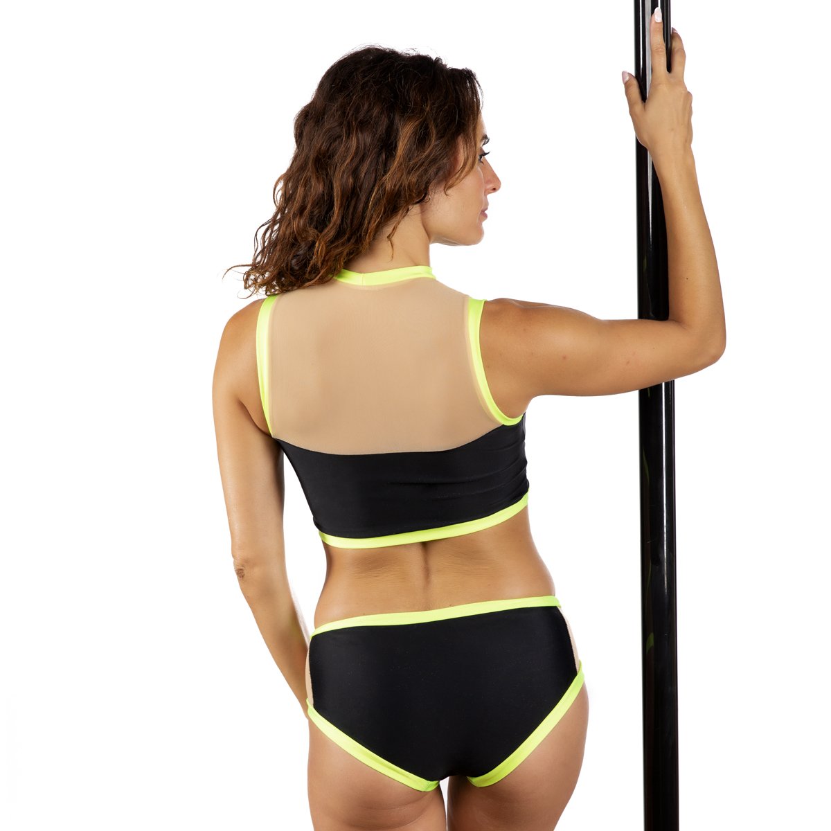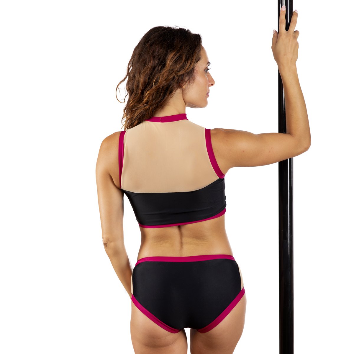 Top in lycra accollato con decolté e dorso in retina elastica.