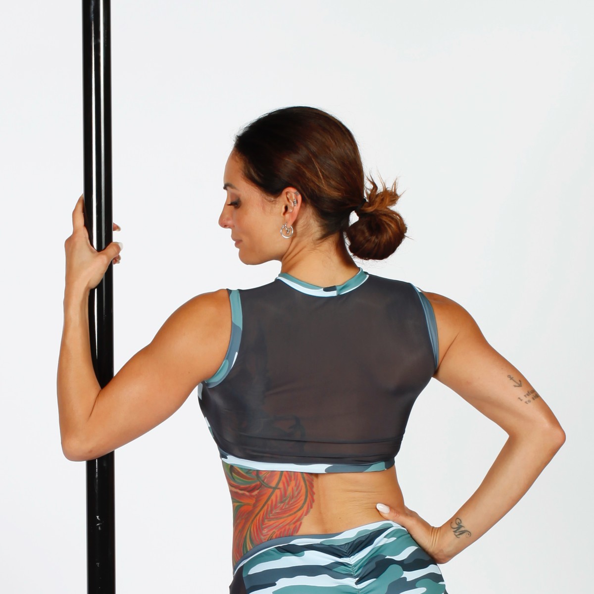 Top accollato in lycra fantasia, decolté e dorso in Siviglia.
