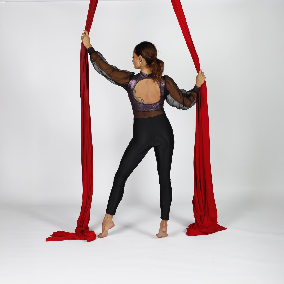 Accademico Aerial performance aderente composto da maniche lunghe morbide in tessuto scintilla. Busto in tessuto Shiny viola sul petto e schiena e retina nera trasparente con colletto e oblò grande dietro. Gambe in lycra monocolore.