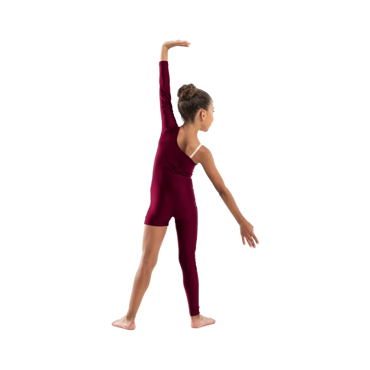 Accademico Aerial basic in lycra bi-elastica, mono spalla con una manica lunga e una con bretella color carne, lunghezza di gamba a pantaloncino e una alle caviglie